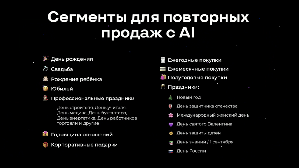2) Полугодовые покупки: Для клиентов, которые делают покупки каждые полгода (например, обновление программного обеспечения). AI напомнит о них заранее.
