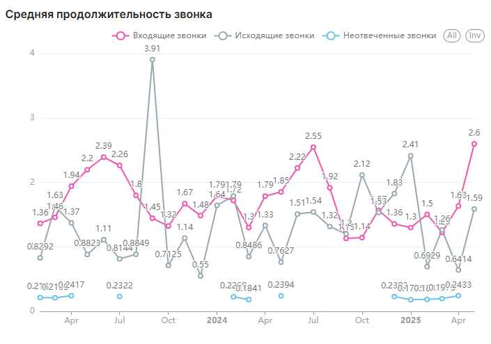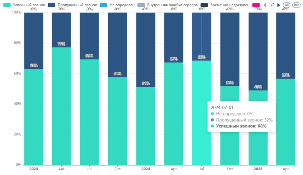 После интеграции 1С-Битрикс24 в работу учреждения стало возможным не только отслеживать показатели в режиме реального времени, но и получать глубокую аналитику по всем каналам коммуникации. В том числе была активирована аналитика телефонии, которая позволила выявить ключевые узкие места.Встроенные инструменты аналитики 1С-Битрикс24 позволяют не просто собирать данные, но и визуализировать их в виде графиков, диаграмм и отчётов. Это помогло руководству не только увидеть проблему, но и понять, как её решить. Например, стало очевидно, что в определённые часы дня нагрузка на операторов резко возрастает, что приводит к увеличению количества пропущенных звонков.