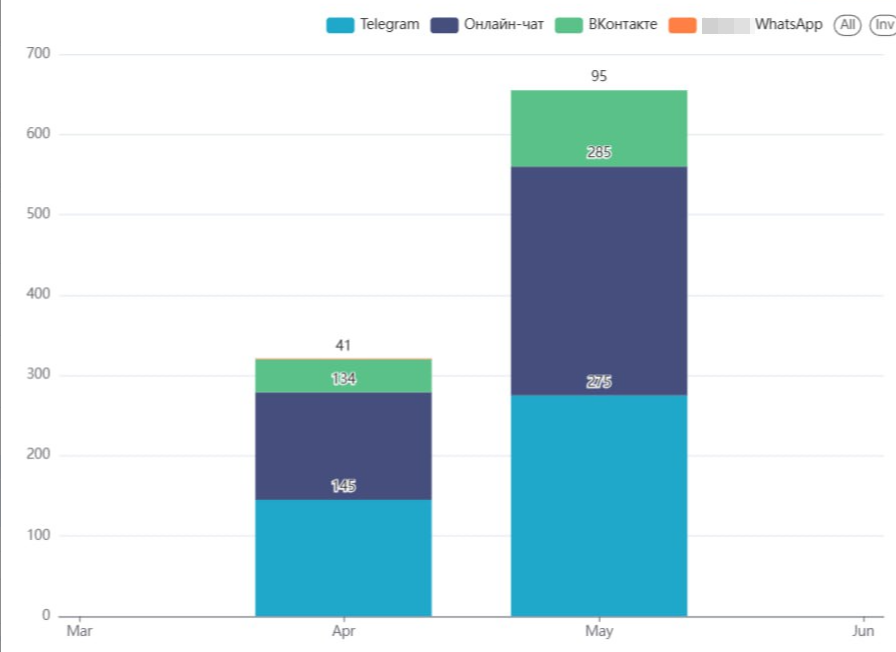 Кроме того, в прошлом году были подключены мессенджеры, что сразу увеличило объём новых лидов — в среднем они составили 54% от общего числа обращений. Это позволило перераспределить нагрузку и начать использовать более лёгкие каналы связи такие как Telegram, WhatsApp и другие. Это привело не только снижению нагрузки на телефонные линии, но и к повышению скорости обработки обращений.