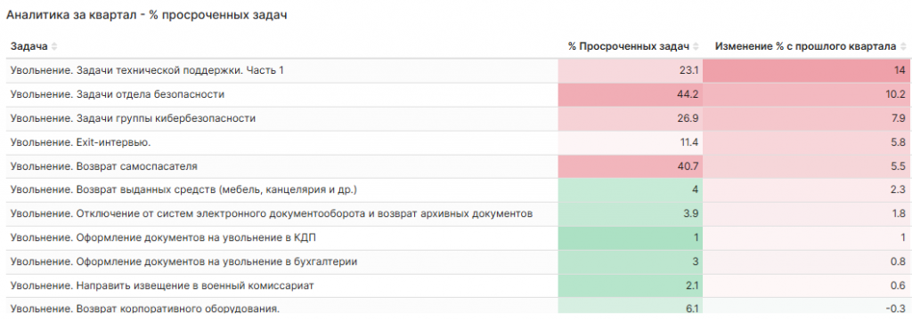 Вторая группа показателей анализирует исполнительскую дисциплину. Дашборд автоматически рассчитывает общий процент просроченных задач по итогам квартала. Для обеспечения корректности анализа задачи, идентичные по смыслу, но различные для определённых категорий сотрудников, объединяются. Например, этап «Задачи технической поддержки. Часть 1» учитывается единообразно для работников, стажеров и практикантов. Это даёт возможность объективно оценить, какие именно этапы процесса — возврат корпоративного оборудования, задачи отдела безопасности или оформление документов в бухгалтерии — становятся регулярными «узкими местами» и требуют пересмотра сроков или перераспределения ресурсов.