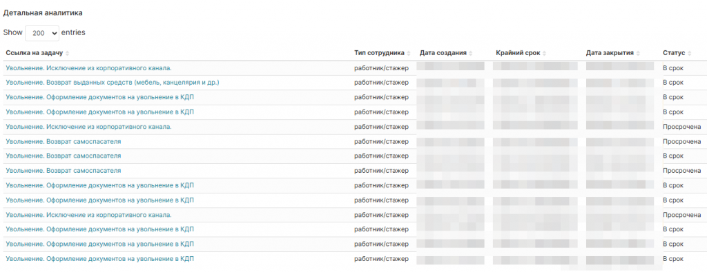 Третья группа обеспечивает детальную аналитику по блокам ответственности. Этот раздел предоставляет возможность для глубокого ситуационного анализа. Данные представлены в разрезе шести функциональных блоков, таких как IT и кибербезопасность, бухгалтерия, административно-хозяйственный отдел и служба безопасности. Руководитель может видеть не только сводную статистику, но и детализированный перечень всех задач: ссылку на задачу, тип сотрудника, даты постановки и крайнего срока, фактическую дату завершения, статус соблюдения срока и ответственного исполнителя. Такой уровень детализации служит инструментом для точечного разбора возникающих проблем, проведения бесед с конкретными исполнителями и обоснованной корректировки внутренних нормативов.