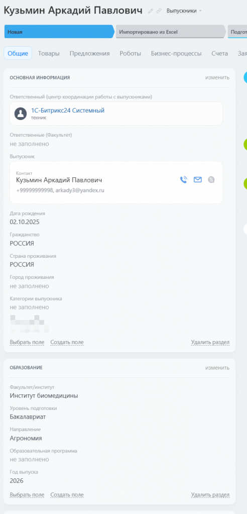 Ключевая функция — автоматическая проверка наличия заявителя в базе. При открытии заявки менеджер нажимает на поля «Выпускник» и «Карточка выпускника»; система выводит совпадения по фамилии, имени, отчеству и дате рождения. Если выпускник уже зарегистрирован, он привязывается к заявке. Если нет — создается новый контакт, а менеджер одним нажатием формирует карточку выпускника с предзаполненными данными. Это исключает дублирование и экономит время.
