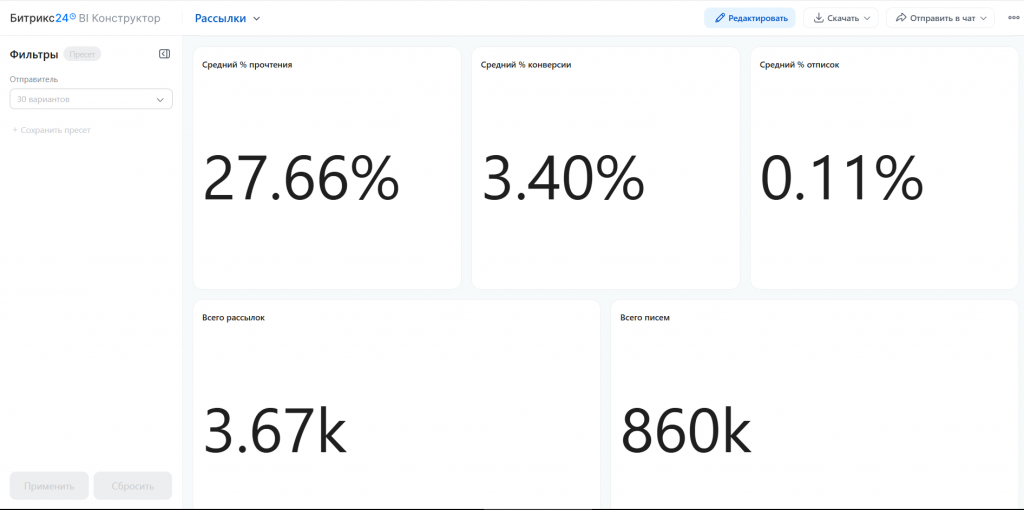 Ключевая особенность сервиса — детальная аналитика по каждой рассылке. После отправки менеджер видит количество доставленных писем, процент открытий, количество переходов по ссылкам, отписки, а также динамику этих показателей по времени. Данные доступны как в обобщенном виде, так и в разрезе конкретных получателей. Это позволяет оценить реальный интерес к отправляемому контенту, скорректировать темы и форматы последующих коммуникаций.